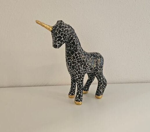 von Hand mit dutzenden Folienplätchen beklebt und mit Klarlack versiegelt.